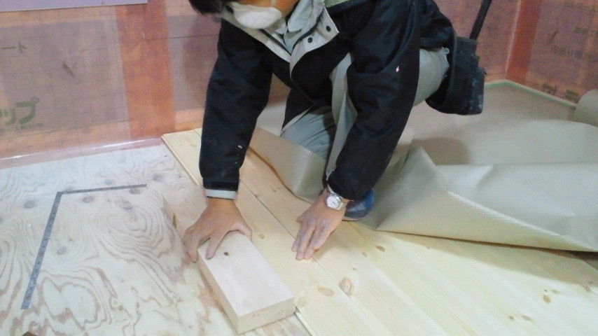無垢パインの床貼り作業
