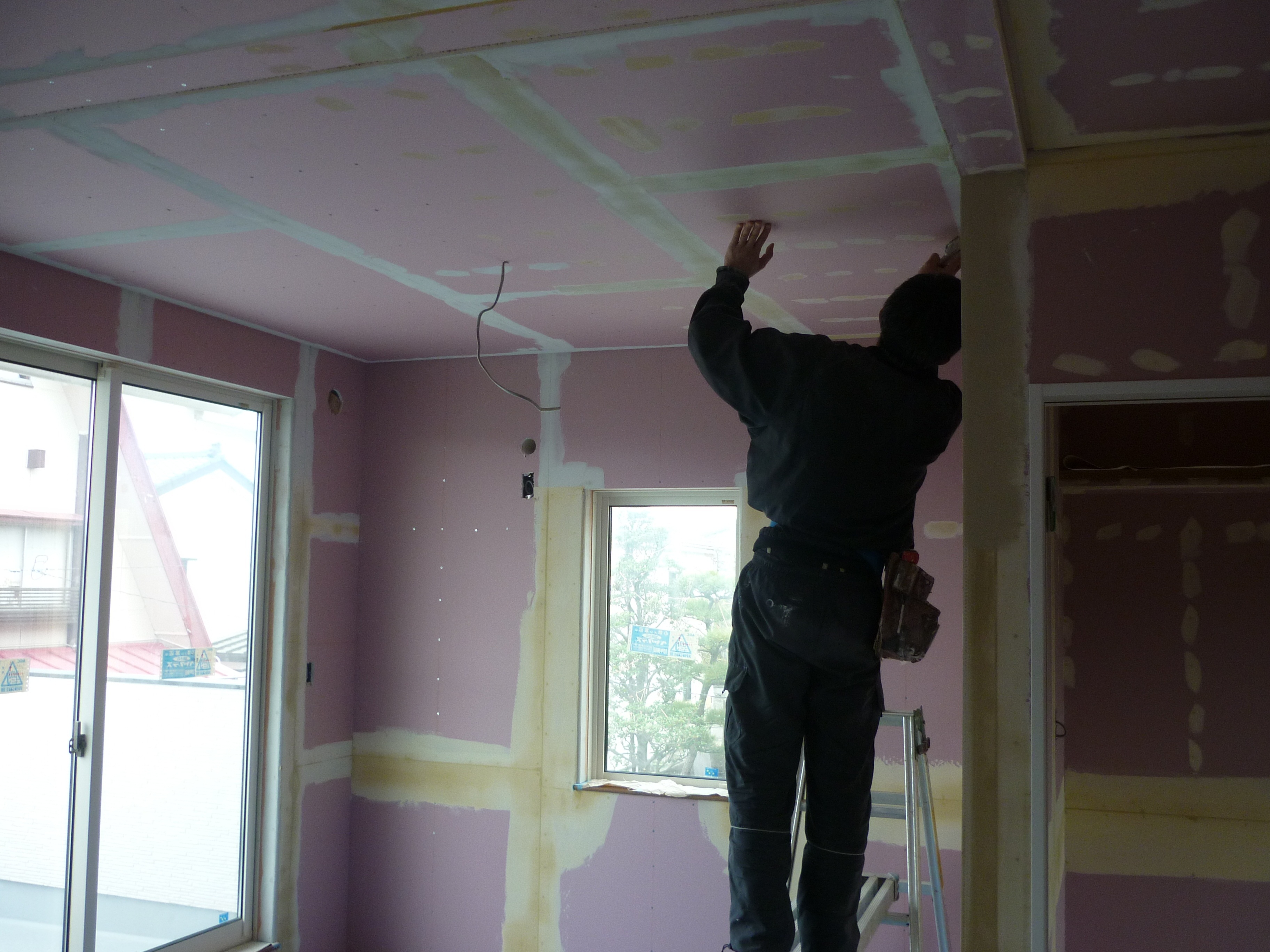 ボードの継ぎ目や、ボードをとめるためににうった釘のあとをうめるために塗ってます。