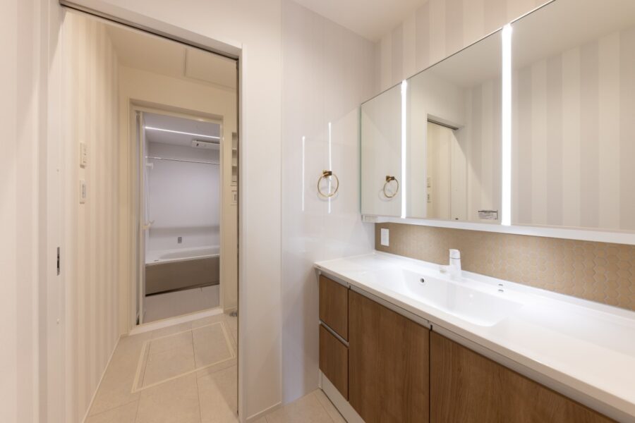 そこで、家族の生活動線と家事動線が交わらずスムーズに流れるよう、玄関ホールから洗面室・脱衣室・キッチンへとつながる裏動線を確保。帰宅後すぐに手洗いができ、荷物の片づけや家事への移行も自然に行えます。また、庭には将来ワンちゃんを迎えた時のためにドッグランスペースを設けました。