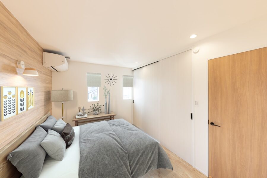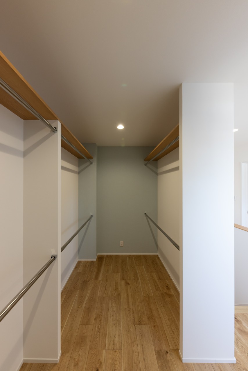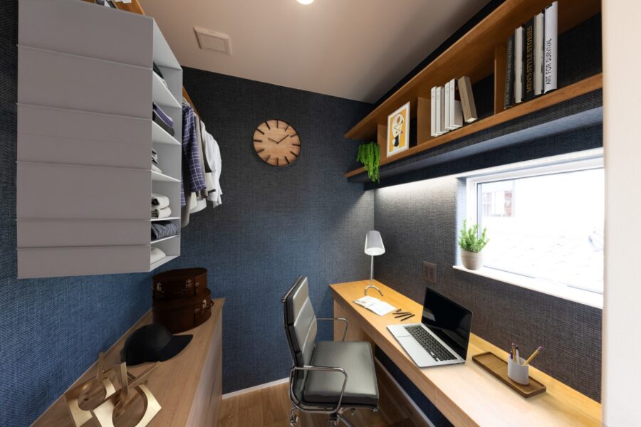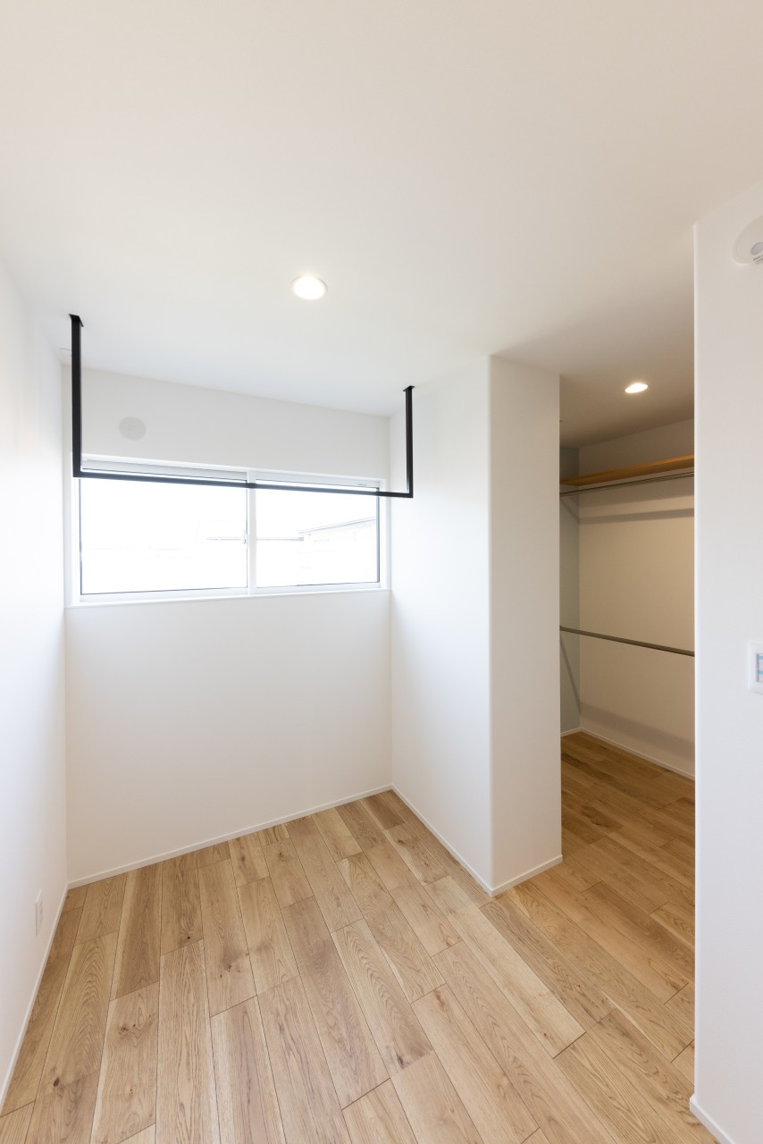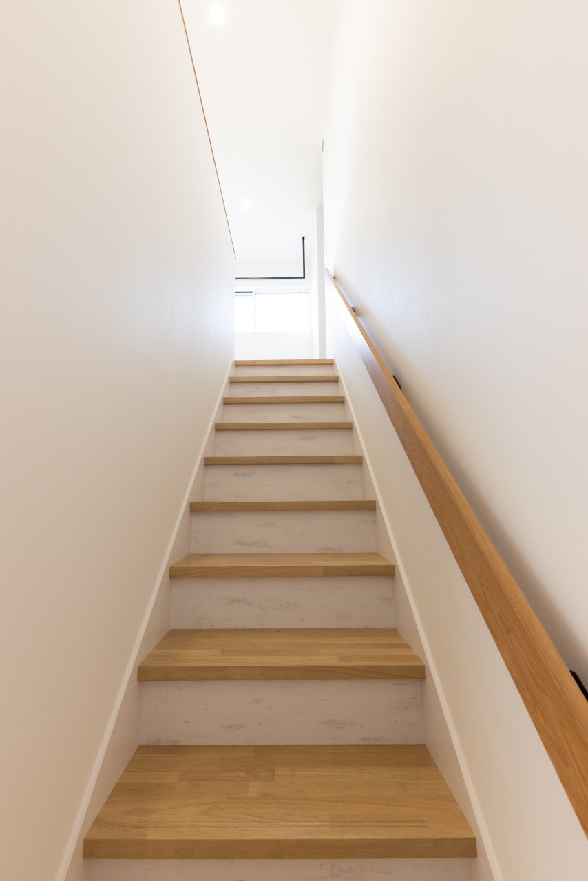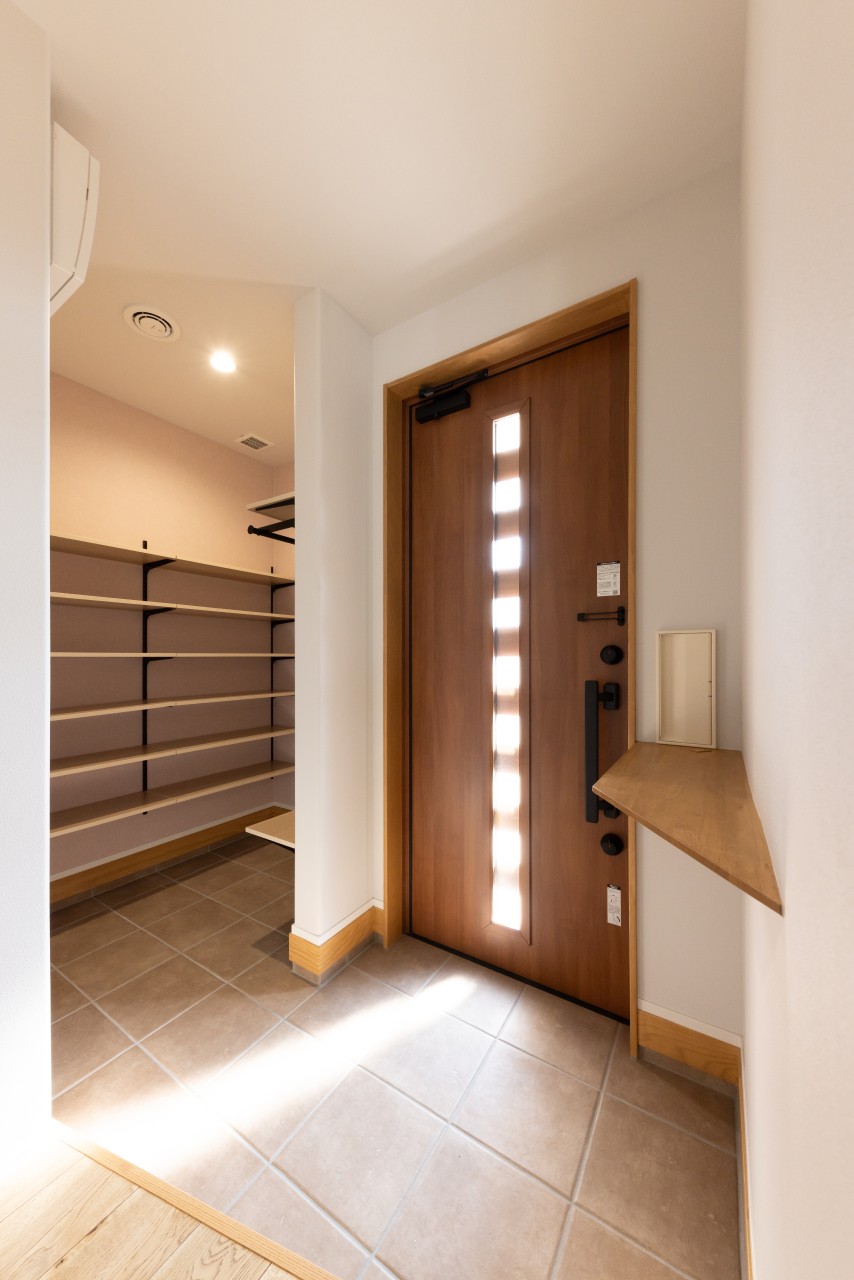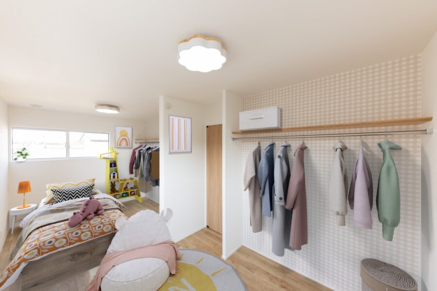 他には子供部屋を仕切って2部屋にできる可変プランや、広いホールを活かした室内干しスペース、充実した収納計画で、成長やライフスタイルの変化にも対応できる間取りとしています。外観は二重にかけた切妻屋根や、白い外壁に木調の玄関ドアを合わせ、天然木を使わずとも、あたたかみを感じられる工夫をしました。