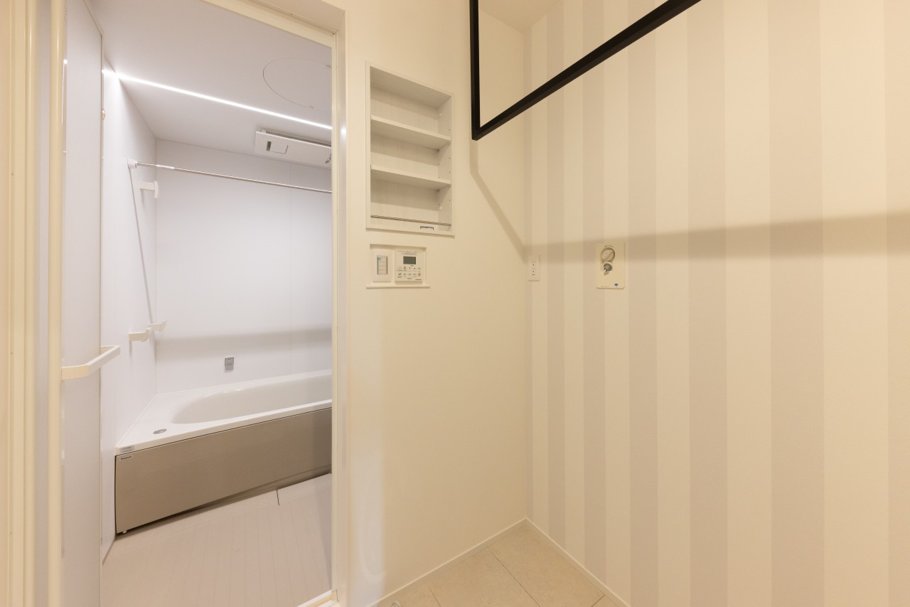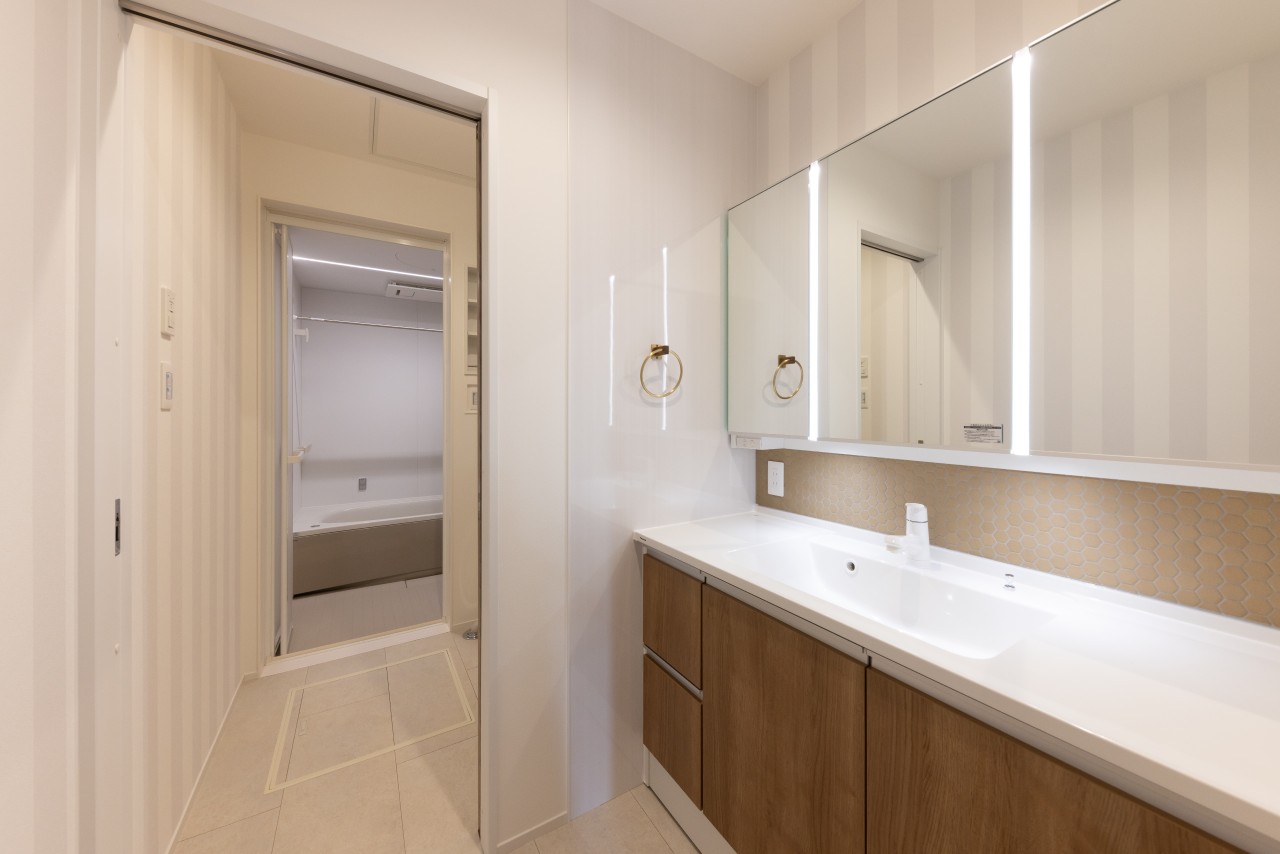 そこで、家族の生活動線と家事動線が交わらずスムーズに流れるよう、玄関ホールから洗面室・脱衣室・キッチンへとつながる裏動線を確保。帰宅後すぐに手洗いができ、荷物の片づけや家事への移行も自然に行えます。また、庭には将来ワンちゃんを迎えた時のためにドッグランスペースを設けました。