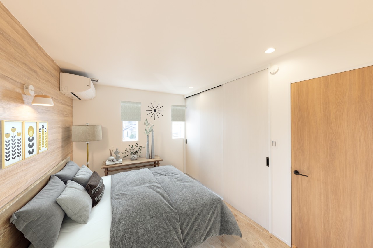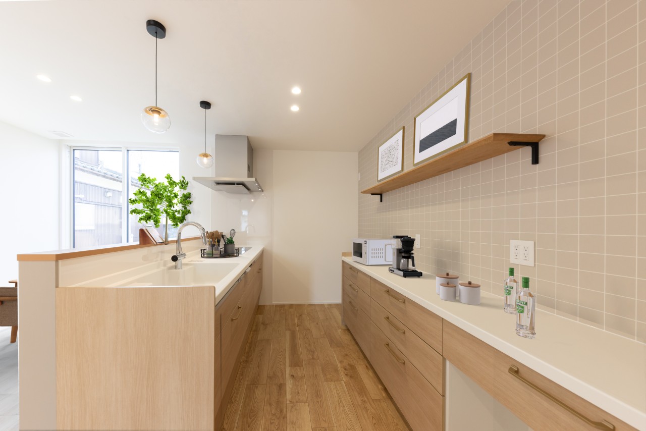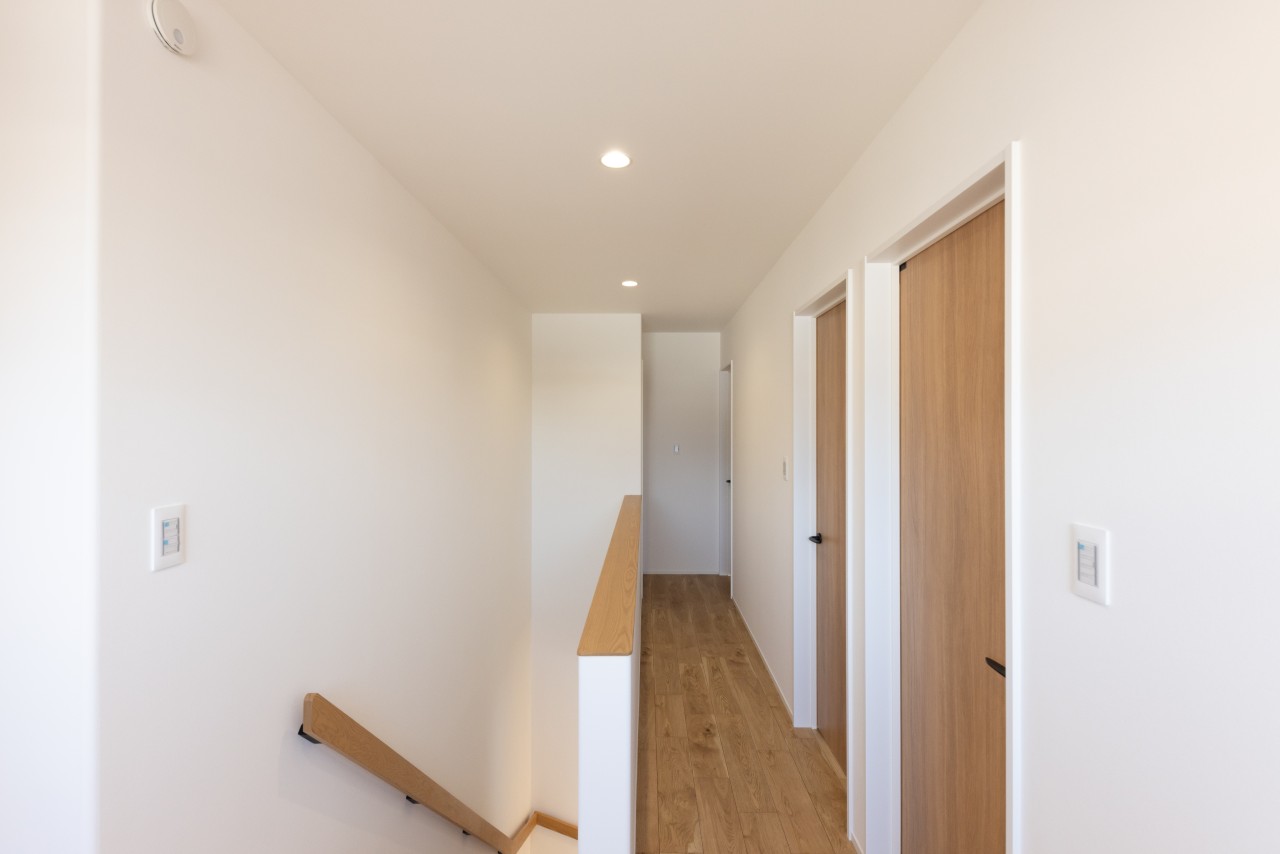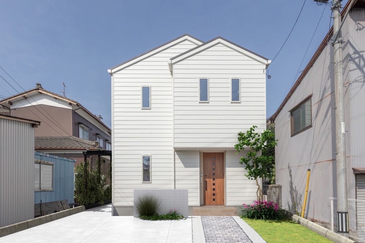 他には子供部屋を仕切って2部屋にできる可変プランや、広いホールを活かした室内干しスペース、充実した収納計画で、成長やライフスタイルの変化にも対応できる間取りとしています。外観は二重にかけた切妻屋根や、白い外壁に木調の玄関ドアを合わせ、天然木を使わずとも、あたたかみを感じられる工夫をしました。